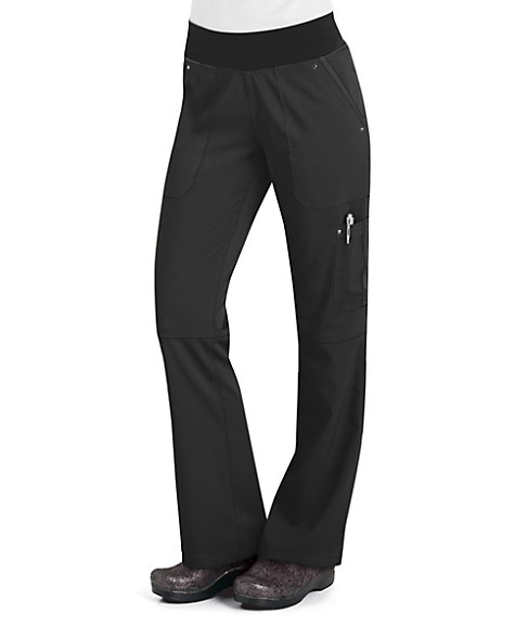 The Healing Hands Purple Label 9133 women’s Tori modern fit scrub pants feature an approximate 2 1/2″ stretch knit waist band that sits just below the waist. Store everything you need with the 2 front side pockets, 2 back pockets with tonal grosgrain ribbon detail, and 1 cargo pocket on the left side with grosgrain ribbon and rivet detail. These straight leg pants have vents at the bottom for ease of movement as well as front and back leg seaming for a fashionable look. Fabric is 77/20/3 poly/rayon/spandex, the waistband is 88/12