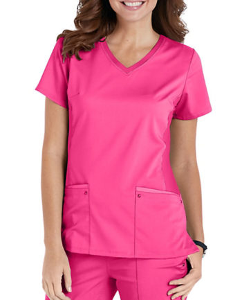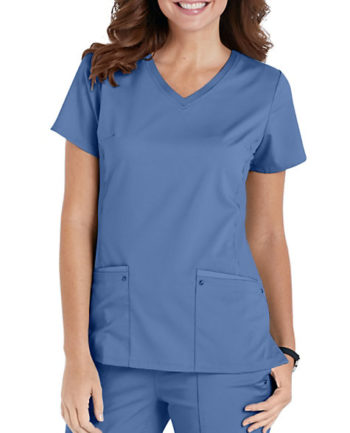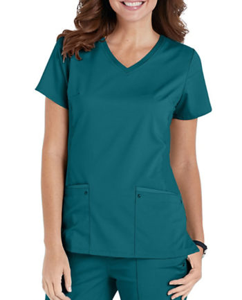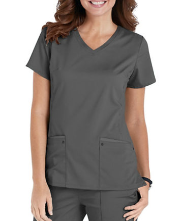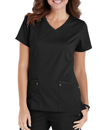 Modern fit Juliet top has a v-neck, accented with knit trim and side stretch panels. The front and back princess seaming allows for a superior fit. For storage, you’ll find 2 front patch pockets with tonal grosgrain ribbon and rivet detail. In addition, there are bust darts and a curved hem. Side slits provide ease of movement. Fabric is 77/20/3 poly/rayon/spandex.